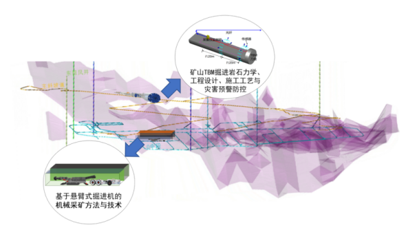 金属非金属矿山“凿岩爆破”开采方式决定了采矿工艺流程无法实现连续作业,而且爆破作业本身具有有害效应与较高安全风险。随着科技水平的发展,煤矿采煤机械、金属非金属矿山采掘机械及全断面隧道掘进机(TBM)等装备与技术相互影响渗透,机械破岩装备向着行业、技术融合的趋势进步,地下矿山迎来了由传统凿岩爆破开采向非爆机械连续开采的新跨越。机械连续开采技术是矿冶集团的重点发展方向。技术方向在机械刀具破岩力学及优化、机械采矿岩石力学、机械采矿工艺、机械采矿机电一体化选型配套、机械开挖岩体稳定性控制及安全保障技术、金属非金属专用机械采掘装备等方面取得了众多创新研究成果,研发形成多项自主知识产权的新一代机械采矿装备及配套产品,构建出一套机械连续采矿的基础理论与技术体系。自主研发的机械破岩试验平台、机械破岩装备选型系统、新型机械破岩悬臂式采矿机、便携式可截割性测试分析仪等,已在众多项目中起到关键支撑作用,并在国内多家地下金属非金属矿山中实现了推广与应用。