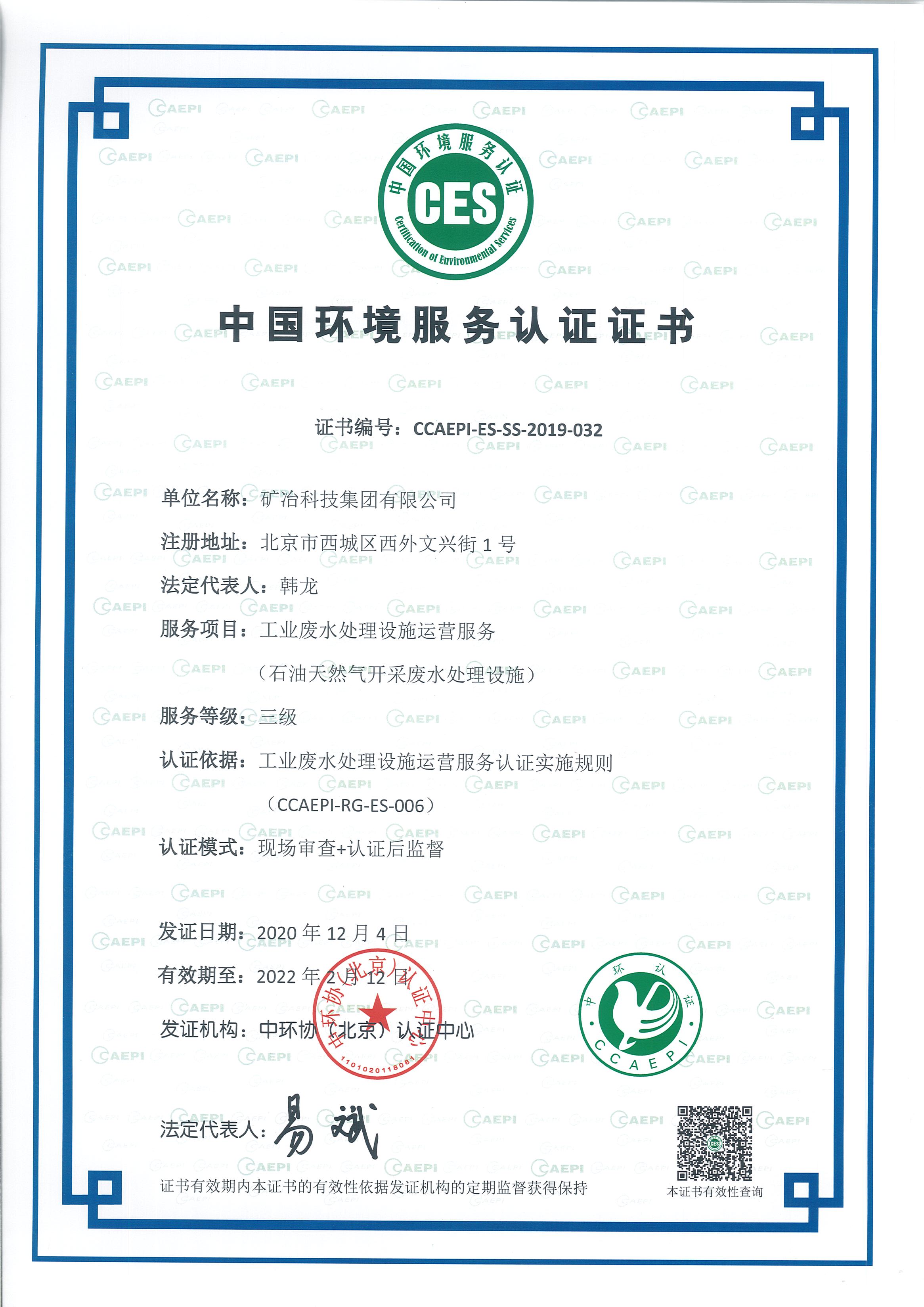 中国环境服务认证证书